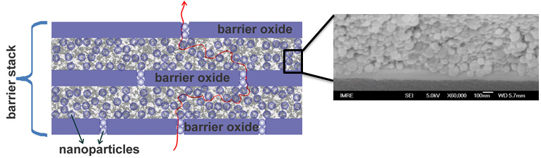 TBF’s core technology is its nanosealing material and barrier stack technology deposited on flexible substrates. Defects such as pinholes, cracks and grain boundaries are common in thin oxide barrier films when fabricated onto plastic substrates. TBF has taken an innovative approach to resolve the ‘pore effect’ by literally plugging the defects in the barrier oxide films using nanoparticles. This reduces the number of barrier layers needed in the construction of the barrier film. TBF’s barrier stack consists of barrier oxide layers and nanosealing layers. The nanoparticles in used in the barrier film have a dual function ‐ not only sealing the defects but also actively reacting with and retaining moisture and oxygen.